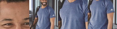 - Grey Three Heather/Black and True Blue Heather/Grey Three are 88/12 polyester/elastane