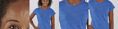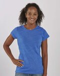 3.8 ounce, 50% polyester/38% cotton/12% rayon tri-blend knit * Ladies' fit * Tear away label * Crew neck * Set-in sleeves with rolled forward shoulder seam
