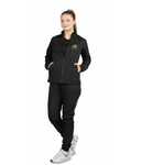 * 100% polyester double-knit * Ladies' fit * Woven label * Front zipper * Set-in sleeves * Front pockets * Dual inside pockets * Striped rib-knit collar, cuffs and bottom band