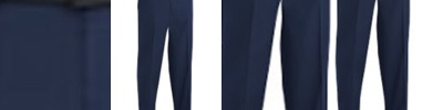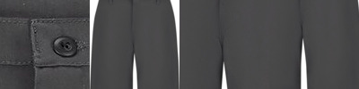 - Two slack-style front pockets, two set-in hip pockets, left has button closure