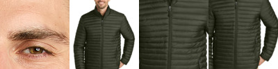 Designed with traditional quilt lines, this insulated full-zip is built for warmth and weather-resistant performance. Features include full-length interior storm flap with chin guard, exposed, molded zippers with Eddie Bauer logo pulls, elastic cuffs, zippered hand pockets and a slight drop tail hem. Includes a decoration access pocket. Packs into zippered left hand pocket. Contrast Eddie Bauer heat transfer logo on left sleeve. Made of 100% polyester ripstop and 5.9-ounce, 100% polyester blown fill. PU coating on back of shell. Durable water-repellent (DWR) finish.